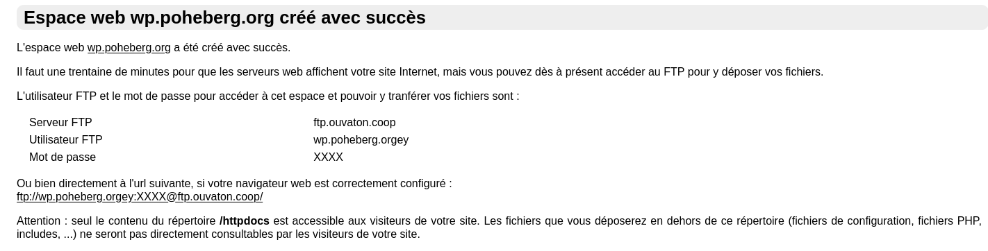 Dans Ouvadmin, à la création d'un espace web, on a toujours la notification de création avec le ftp et les XXXX pour le mot de passe ftp, mdp visible en clair si on se met sur les X.